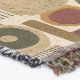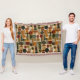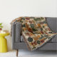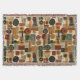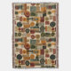 Sophisticated mid-century geometric pattern blanket featuring layered circles, arches, triangles, and rectangles in forest green, burnt orange, ochre, and cream on a black background. Rich textures and retro-modern shapes create a bold design ideal for Bauhaus lovers, vintage décor fans, and anyone drawn to moody modern style.