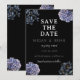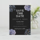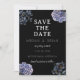 A bold and sophisticated Save the Date featuring dramatic dusty blue and grey floral illustrations against a stark black background. The crisp white typography and classic layout set an elegant, moody tone. Perfect for a formal evening or a sophisticated wedding.