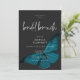 Dieses Polterabend Einladungs-Design zeichnet sich durch ein dunkles, moody-Design aus, das einfach, aber atemberaubend ist. Ein schwarzer Holzkohle-Hintergrund ist die perfekte Leinwand für einen Single mit aquamariner blauer Motte, dessen Flügel sich für den Flug ausbreiten. Einzigartig und elegant, kann dieses Design für jede Jahreszeit genutzt werden. Erstellt von der einfachen Farmhouse Press.