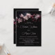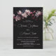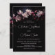 This dark moody romantic wedding invitation features light pink magnolia flowers on a black background and bride and groom name in an elegant classic calligraphic script.