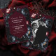Set die Bühne für ein überwältigend elegantes Ereignis mit diesen gotischen Save the Dates. Diese luxuriöse Blumenhochzeit bewahrt die Dattelkarten mit einem Strauß aus schwarzen und roten Pfannkuchen und blauen Beeren vor einem roten Hintergrund. Die Rückseite ist ein Ort für Ihr Foto. Es ist perfekt für eine dramatische und unvergessliche Feier. Sie sind ideal für Liebhaber von dunkler Romantik und zeitlosen Reiz.