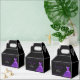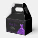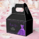 A beautiful dark purple themed elegant watercolor dress gown on a black background with faux glitter at the top and bottom of the favor box.