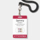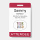 Personalisieren Sie unser berufliches Abzeichen mit Ihrem Event-Logo, dem Teilnehmernamen und anderen benutzerdefinierten Texten. Es ist aus Kunststoff pvc und mit einem Lanyard, Clip oder einer einziehbaren Rolle erhältlich. Design in dunkelrot und anderen Farben mit einem modernen minimalistischen Design von MISOOK. Alle Farben sind anpassbar. Optional können Sie auf der Rückseite weitere Inhalte hinzufügen (QR-Code, Termini, etc.). Einfache Anpassung des Besuchertitels (VIP-Gast, Besucher, Lautsprecher, etc.). Keine Mindestbestellmenge und keine Einrichtungsgebühr.