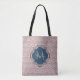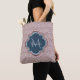 Ein eleganter, dunkelroter Deko mit gewölbtem Jakobsmuster-Totbeutel mit einem navy blauen Quarrefoliengeschirr, das Sie ganz einfach mit Ihrem eigenen Monogramm und Namen personalisieren können. Dies ist Teil der Spiced Apple Scallops Sailor Blue Monogram Spring Collection.