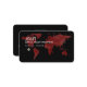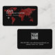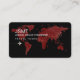 Alte bordeauxfarbene Karte der Welt auf schwarzem Hintergrund, mit dem Bild eines kleinen Flugzeugs, personalisiert mit dem Namen und den Initialen des Agenten.