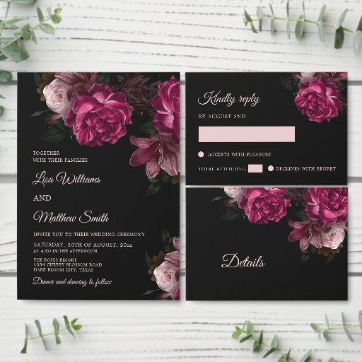 Dark romantic hand drawn roses wedding invitation with bride and groom names in an elegant classic script.