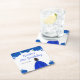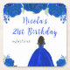 This birthday party coaster features faux glitter royal blue floral flowers and a beautiful princess with dark skin and an elegant dress. This is perfect for a birthday party.