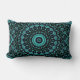 Bring vibrant, calming energy into your home with this eye-catching lumbar pillow. The design features an intricate mandala pattern with a mesmerizing radial symmetry in shades of turquoise and teal against a dark, nearly black background. The mandala design is made up of delicate floral motifs and flowing lines that radiate outward like petals, creating a sense of depth and motion.