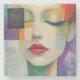 Dieses atemberaubende abstrakte Frauenportrait verbindet Surrealismus mit lebendigen Farbblocktechniken. Ihr ruhiger Ausdruck, geschlossene Augen und fette rote Lippen sind durch eine Mischung geometrischer Formen und malerischer Texturen gerahmt. Ein modernes, avantgardistisches Design, das eine Touch moderner Eleganz ergänzt.