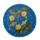 Fische schwimmen zwischen grünen Lilienblättern mit gelben Blüten. Gelb, orange und braun koi. Hintergrund ist dunkelblau. Aus origineller Seidenmalerei von Susan Lilly. (Lilikai)