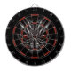 Dartboardentwurf mit als Hintergrund ein unheimliches Schauen, ruhiges ein Gesicht des verwickelten, silbernen Graus oder ein Schädel oder eine Maske, mit Rot, piercing Augen, auf Schwarzem. Alle Betten des Dartboard sind sichtbar und von einander durch einen dünnen, Weißglühen um jedes von ihnen. getrennt. Die traditionellen Farben des Rotes und des Grüns sind durch… Rot und Schwarzes ersetzt worden.
