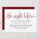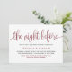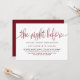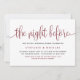 Feiern wir Braut und Bräutigam vor der Hochzeit. Mit dieser eleganten Probe-Dinner-Einladung laden Sie Familie und Freunde ein. Es zeichnet sich durch Kalligraphie mit klassischer Typografie aus. Personalisieren Sie diese durch Hinzufügen von Namen, Datum, Adresse und anderen Details. Dieses rote Skript The Night Before Einladung ist perfekt für jede Hochzeit und Thema.