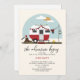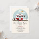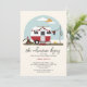 Abenteuer-Kinderdusche mit der Abbildung von Vintagem, roten und weißen Wohnwagen mit Lumberjack karierte Babykleidung, die an der Wäscheleine hängt, die mit Birkenbaum unter einem blauen Himmel mit Sonne und Wolken verbunden ist. Text sagt: "Das Abenteuer beginnt" Der Camper ist mit Makrame, Ballongarland, Pampas, Kakteen, Taschengärland und Pflanze in Terrakottopacken dekoriert.