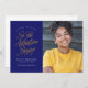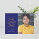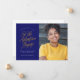 "So das Abenteuer beginnt" Skript minimalistisch königsblauen und gelben goldenen Foto Abschluss Ankündigung. Personalisieren Sie mit Ihrem Studienjahr, Name, Schulname und Foto. © Kimbellished, LLC