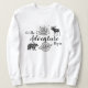 Lass das Abenteuer beginnt typografisches Sweatshirt für Frauen, mit Gehbär, Elche, Wanderlust Logo und Naturlogo, für begeisterte Wanderer und Outdoorabenteurer. Eine typografische und Bildcollage.