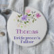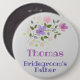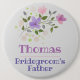 Einführung des Vaters des Bräutigams - ein Button-Abzeichen mit dem Namen und einer Blumendarstellung. Abzeichen zur Identifizierung von Hochzeiten.