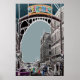 Dieses auffällige, quirlige Plakatprint ist ein digitales Bild des berühmten Glasgow Barras. Der in den 20er Jahren eröffnete Weltmarkt ist bei Einheimischen und Touristen beliebt. Es liegt im östlichen Ende des Stadtzentrums und war einst der größte Open-Air-Markt Europas. Das Bild zeigt den Markteintritt mit Händlern und Pägern Fräsen unten.