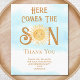 Diese kleine Babydusche-Dankeschön-Karte enthält den Text "Here Comes The Son" in stilvoller Typografie mit einer lächelnden Aquarellsonne, blauem Himmel und Wolken. Einfach anpassbar. Weil wir unsere Kunstwerke erstellen, werden Sie dieses exakte Bild von anderen Designern nicht finden. Original Wasserfarbe © Michele Davies.