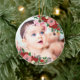 Blumenverzierung, der Sie Ihr eigenes Foto zu Ehren des ersten Weihnachten Ihres Babys hinzufügen können. Es hat mit Blumenanordnung in rosa, in Rotem und dem Grün, das Poinsettias, Rosen und aus Mistelzweig besteht verziert.