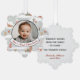 Eine Weihnachtskarte, die Sie als Ornament benutzen können! Ersetzen Sie durch Babybild oder Foto und personalisieren Sie den Text vorne und hinten mit Ihren eigenen Namen und Urlaubsbotschaft Ihrer Wahl. Erhältlich in Schneeflocke oder skallopierter Kreisgestaltung.