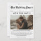 Extra! Extra! Du wirst heiraten! Diese Zeitung rette den Tag und lässt Ihre großen Neuigkeiten offiziell werden. Die Einrichtung ist in Schwarz-Weiß gehalten, das Eiffelturm-Foto ist klassisch eingerichtet und eignet sich ideal für Paare, die etwas Romantisches und Einzigartiges gewollt haben, ohne viel zu investieren.