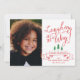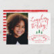 Diese lustige Urlaubskarte enthält den Text "Laughing All The Way" mit drei kleinen Weihnachtsbäumen, ein Banner mit den Worten "Frohe Weihnachten" und einen Platzhalter für Ihr Foto. Auf der Rückseite sind rote Streifen in Aquarellfarben zu sehen.