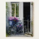 Ein Fahrrad steht in der Nähe der Tür eines Hauses in einem Sommergarten. Das Fahrrad ist ein einfaches Modell mit einem Korb vorne. Der Korb ist mit Blume gefüllt, die in voller Blüte sind. Sie schaffen eine schöne und farbenfrohe Anzeige.