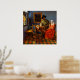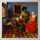 Bringen Sie ruhige holländische Eleganz in Ihren Raum mit "Das Glas Wein" von Johannes Vermeer. Die in einem sonnendurchfluteten Innenraum angesiedelte Szene fängt einen verfeinerten Moment des Gesprächs und der Werbung ein, in dem eine junge Frau an einem Tisch sitzt, während ein Herr ein Getränk anbietet. Vermeers charakteristisches Licht strömt durch das bleiverglaste Fenster herein und betont den Glanz von Glas, die Weichheit des Stoffes und die reichen Muster der Tischdecke und des gefliesten Bodens.