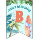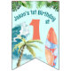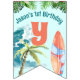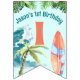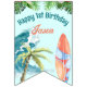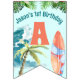 Das große 1. Geburtstag Surfen Retro Strand Party personalisiert buntfahnen glücklichen Geburtstag Banner. Eine große blaue Welle, Palmen und ein Surfbrett, schöner Sommer, Beach-Geburtstag-Party-Thema.