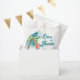 Das große 1. Geburtstag Surfen Retro Beach Party danke Ihnen für die Tasche Vorlage. Eine große blaue Welle, Palmen und ein Surfbrett, schöner Sommer, Beach-Geburtstag-Party-Thema.