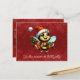 Eine niedliche glückliche Biene mit Geschenken in ihren Flügeln, auf einem roten Schneeflockenhintergrund. "'Das ist die Saison zu BEE jolly" Text vorne mit Weihnachtsbotschaft auf der Rückseite, auch ein roter Schneeflocken Hintergrund.