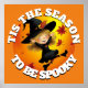Das ist die Jahreszeit zu spuken und eine niedliche Hexe in einem schwarzen Hut tanzt in den Herbstlauben.
