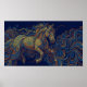 Ein Poster in Lebensgröße und Nahaufnahme eines Pferdes, gezeichnet mit weichen gelben, blauen und orangen Linien auf einem dunkelblauen Hintergrund. Abstrakte Vektorfraktalkunst, Wellenfunktion, Zentangle-Stil und 3D-Schattierung verbinden sich zu einem faszinierenden, komplizierten Muster. Die lebendigen, fließenden Linien erzeugen ein Gefühl dynamischer Bewegung vor dem tiefen, kontrastierenden Hintergrund und rufen eine kraftvolle und künstlerische Darstellung des Tieres hervor.