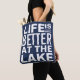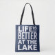 In unserer lakeside-schicken Totentasche finden Sie "Life is Better at the Lake" in der modernen weißen Blocktypografie auf einem reichhaltigen marineblau Hintergrund.