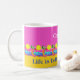 Diese Tasse hat den Slogan: Das Leben am Strand ist besser. Es kann mit deinem Namen personalisiert sein. Es ist mit einem frieze gefeiert Strandleben, mit Sonnenschein, Palmen, blaues Meer und goldenem Sand dekoriert. Das Design wird durch hellrosa und sonnengelbe Farbblöcke ergänzt. Das Kunstwerk ist ein originelles, einzigartiges, handgezeichnetes, zeichnend, digital gefärbtes Werk.