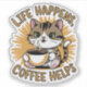 Eine charmante Abbildung einer niedlichen Katze, die aufrecht sitzt und eine warme Tasse Kaffee mit beiden Pfoten hält. Die Katze hat einen entspannten, inhaltlichen Ausdruck, als würde sie den Moment genießen, mit Dampf, der sanft aus der Tasse steigt. Im Hintergrund erwartet Sie ein gemütliches Café-Ambiente mit sanfter, warmer Beleuchtung. Der Satz "Leben passiert, Kaffeehilfen" wird in elegantem, spielerischem Schriftart hervorgehoben dargestellt, und fügt sich perfekt in die Szene ein, was die beruhigende Botschaft verstärkt. Das Gesamtgefühl des Bildes ist gemütlich und beruhigend, was das Wesen einer perfekten Kaffeepause einnimmt.