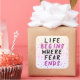 Phantastisches motivierend Zitat zum Leben - Das Leben beginnt, wo die Angst endet. Geschrieben in moderner Typografie und einem bunten Konfetti Hintergrund.