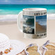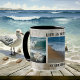 Ein Foto kollage Tasse mit eigenen Fotos gerahmt durch ein verwittertes Holzdesign. Ideal für ein Strandhaus.