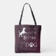 Eine perfekte Tasche für diejenigen, die das Leben viel besser mit einem Hund darin finden. Das Design der Tote-Tasche enthält den Text "Das Leben ist besser mit einem Hund." mit einem Pfotenprint und Hund-Silhouette-Verzierung vor einem tiefen magentafarbenen rustikalen Holzhintergrund. Auch zusätzliche Geschenkartikel sind in diesem Design erhältlich.