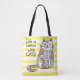 Niedliche lustige Doodle einer Katze, die mit geschlossenen Augen aufsitzt, rosa Wangen und bräunliche Flecken. Für sie links sind die Worte, das Leben ist besser mit Katzen in einem lustigen schwarzen Schriftart. Der Hintergrund ist ein hübsches Muster aus gelben und weißen Streifen.