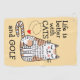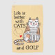 Niedliche lustige Doodle einer Katze, die mit geschlossenen Augen aufsitzt, rosa Wangen und bräunliche Flecken. Für sie links sind die Worte, das Leben ist besser mit Katzen und Golf in einem lustigen schwarzen Schriftart. Ein kleines, rotes Liebe-Herz bläst sich vom Buchstaben C ab, der Hintergrund ist beige.