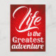 Ein positives Kalligrafie-Set mit rotem Radialgradientenhintergrund. Das Leben ist das bestste Abenteuer, das für jeden, der eine positive Einstellung hat, eine gute Geschenkidee ist.