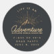 Abschluss Save the Date Aufkleber mit goldfarbener Abbildung auf schwarz-grauem Hintergrund. Entworfen mit einer Abbildung eines Berges, in dem die Sonnenstrahlen von hinten leuchten. Typografie sagt: Das Leben ist ein Erlebniserlebnis Traumwelt entdecken.