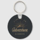 Ein Schlüsselanhänger mit einer goldfarbenen Abbildung auf schwarz-grauem Hintergrund. Entworfen mit einer Abbildung eines Berges, in dem die Sonnenstrahlen von hinten leuchten. Typografie sagt: Das Leben ist ein Erlebniserlebnis Traumwelt entdecken.