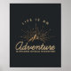 POster mit einer goldfarbenen Abbildung auf schwarz-grauem Hintergrund. Entworfen mit einer Abbildung eines Berges, in dem die Sonnenstrahlen von hinten leuchten. Typografie sagt: Das Leben ist ein Erlebniserlebnis Traumwelt entdecken.