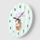 Eine Uhr mit einem lustigen Zitat mit einer Illustration einer 3-Scoop-Eisdiele mit bunten Sprinklen. Eine Eistüte mit Schokolade, Erdbeere und Vanille. Eine Schüssel mit neopolitischem Eis und einer Kirsche auf der Oberseite. Erdbeeren und Ananas stehen neben den Schalen. Minzgrün-weiße Streifen Muster im Hintergrund.