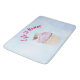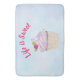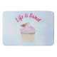 Ein Badematt mit dem Text: Das Leben ist süß. Entworfen mit einer Illustration eines leckeren Kuchens mit rosa Wirbel und einer Beere mit Blätter im Zuckerguss eingebettet. Set auf hellblauem pastellfarbenem Aquarell.