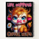 Ein lustiges und sarkastisches Design zeigt eine süße Highland-Kuh, die mit einer schönen weißen Margerite und einem Kaffee-To-Go-Becher sitzt. Die Kuh mit großen blauen Augen und einem ernsten Gesichtsausdruck trägt einen Lippenstift-Kuss auf ihrer Wange und ein lebendiges orange-weißes Fell. Der farbenfrohe Text lautet: "Das Leben passiert, Kaffee hilft". Dieses Design ist auf verschiedenen Produkten erhältlich und eignet sich perfekt als Geschenk für Kaffeeliebhaber.