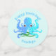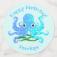Der niedlichste kleine Aqua-Blau gepunktete Oktopus, den Sie je gesehen haben, in zwei Ozeanblau-Farbtönen mit grünen Algen und den Worten Happy Birthday und einer Namensvorlage in passendem Blau. Sie können Ihre eigene Hintergrundfarbe wählen. Das ist perfekt zum Geburtstag eines Kindes. #nautic #underthesea #octopus