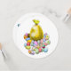 Das Osterküken steht auf dem großen goldenen Ostereier, das zu den kleinen bunten Ostereiern gehört, die für die Osterfeier dieses Jahres bereit sind.